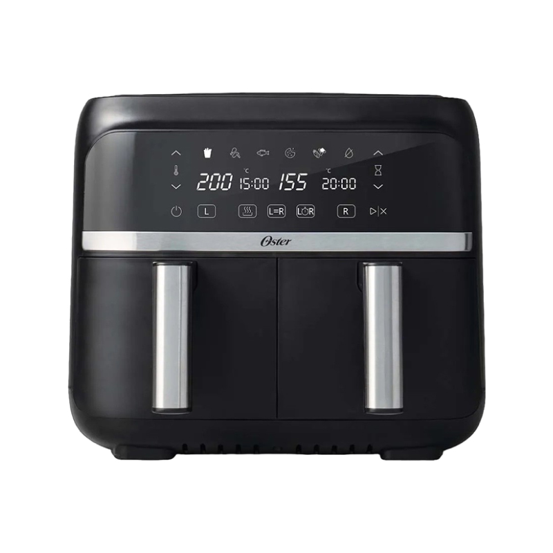 Cociná dos alimentos al mismo tiempo con sus 2 canastas de 3.8 L cada una (7.6 L en total). Usá cada zona de forma independiente o sincronizada, con bandejas extraíbles de recubrimiento Oster® DiamondForce. Incluye panel digital con 6 funciones preprogramadas y diseño compacto con detalles en acero inoxidable. 40.1 cm x 37.5 cm x 34 cm.
