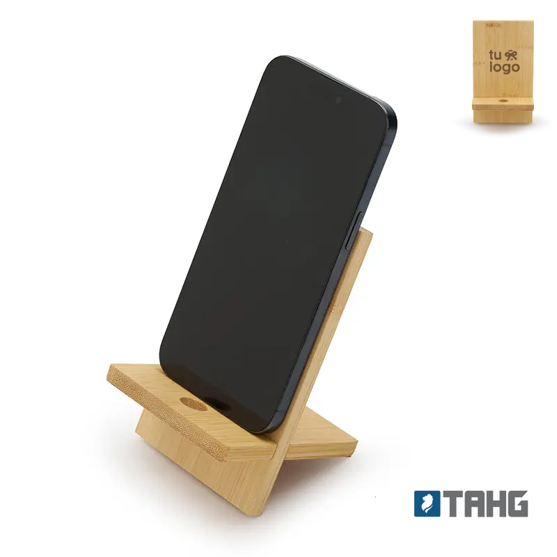 Soporte para teléfono fabricado en bambú. Práctico, liviano y fácil de transportar, es el accesorio perfecto para mantener tu dispositivo estable mientras realizas videollamadas, ves contenido o trabajas cómodamente, tanto en casa como fuera de ella. Además, incluye un orificio que permite el paso del cable facilitando la carga del dispositivo mientras está en uso.