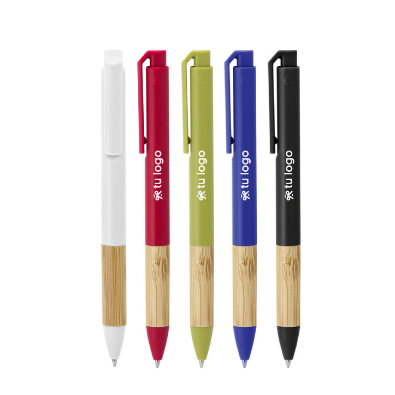 Diseño simple, estilo sostenible. Bolígrafo retráctil. Cuerpo, puntera y pulsador de plástico reciclable. Agarre de bambú. Pintura acabado mate. Medidas: 1,1 x 14,3 cm