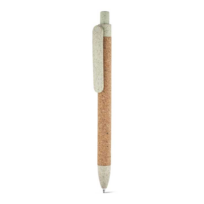 Bolígrafo retráctil ecológico fabricado en fibra de paja de trigo y corcho. Detalles granulados en el color. Tinta azul punta redonda, grosor 1.0MM. Medidas: ø1,1 x 14 cm.