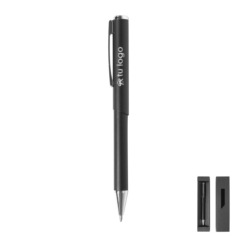 Acero inoxidable. Boligrafo rollerball. Cuerpo laqueado negro mate. Clip y puntera color plata. Tinta negra. Presentación en caja de regalo.