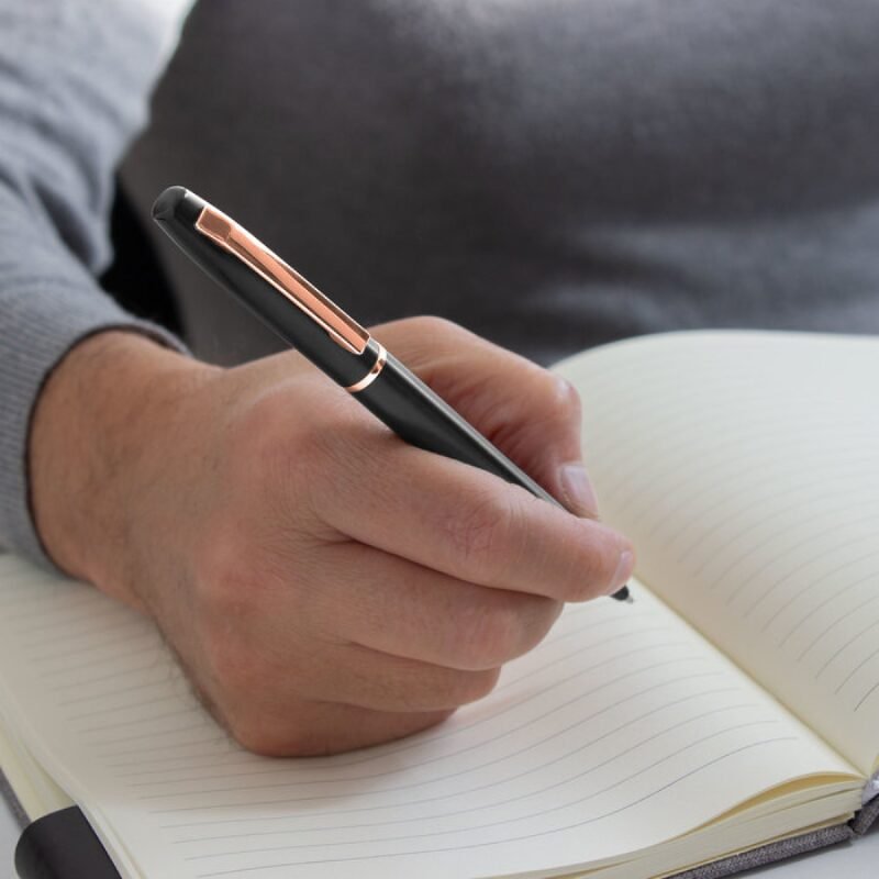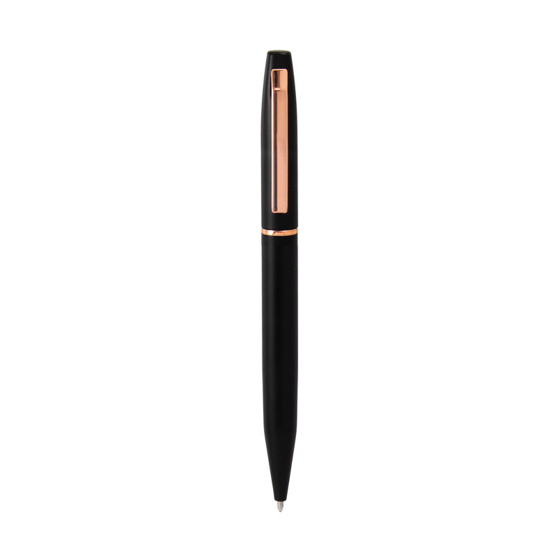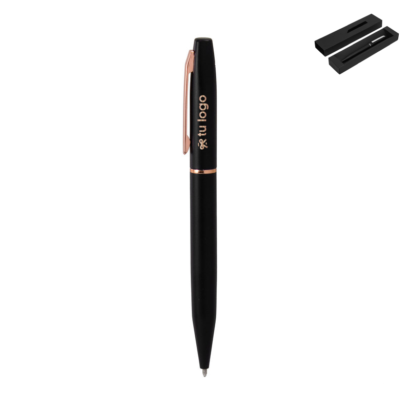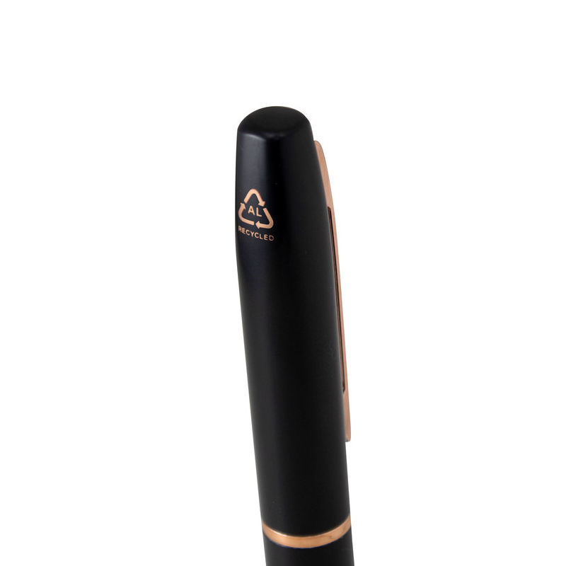 Diseño elegante para quienes valoran calidad y sostenibilidad. Bolígrafo con apertura giratoria. Cuerpo metálico en negro mate. Cuerpo de aluminio reciclado. Destape electroplateado en gold rose en la parte superior. Recarga metálica. Clip y anillos metálicos color gold rose.