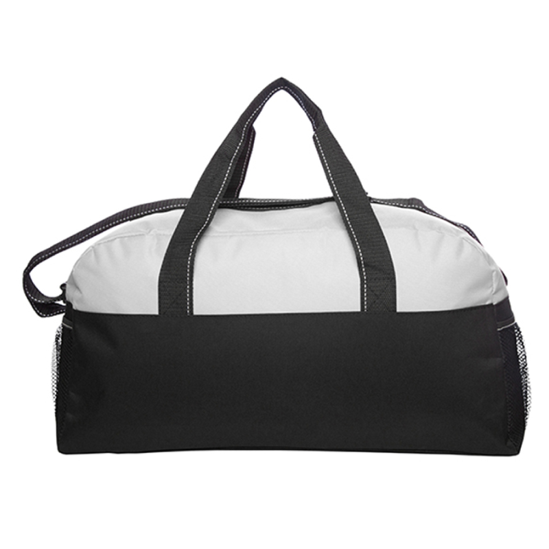 51 x 18,5 x 25 cm. Capacidad 23 litros aprox. Poliéster 300D. Bolso con bolsillos de redes en los laterales. Dos manijas, correa ajustable y cierre principal con vivos en color blanco.