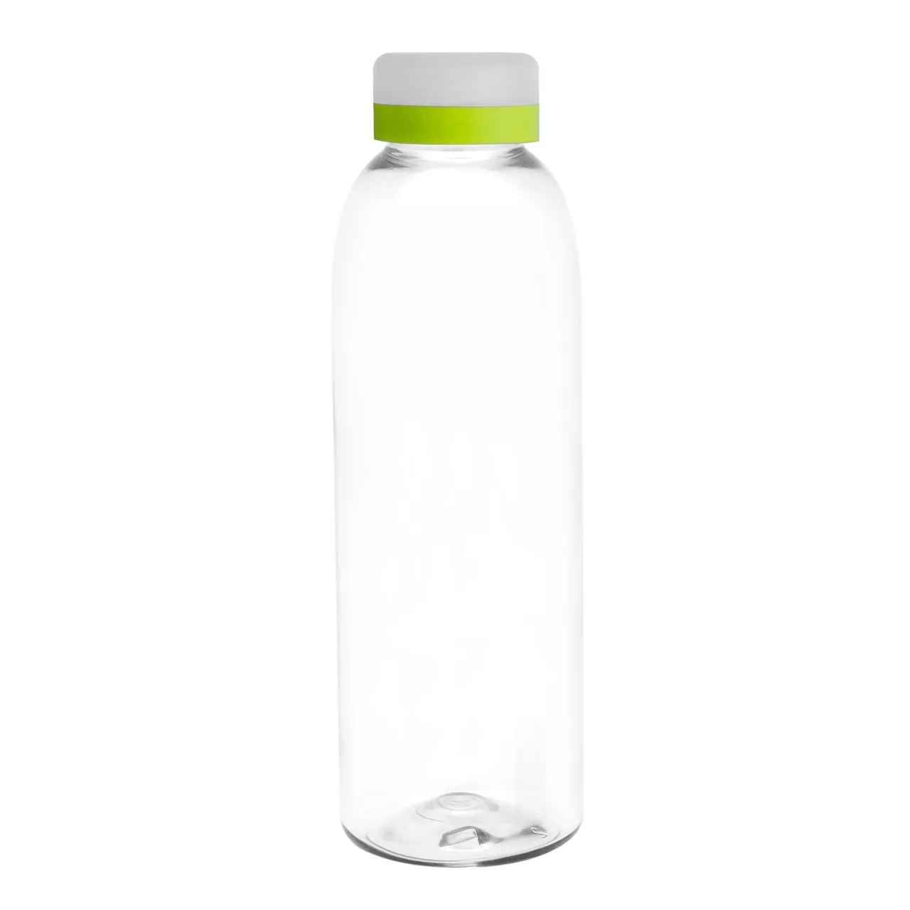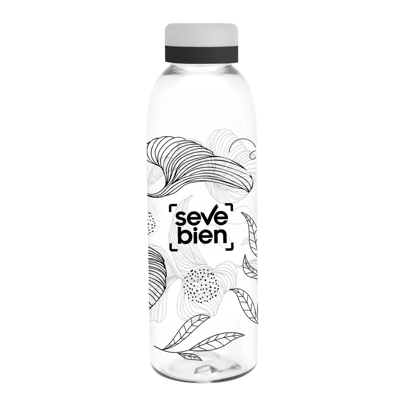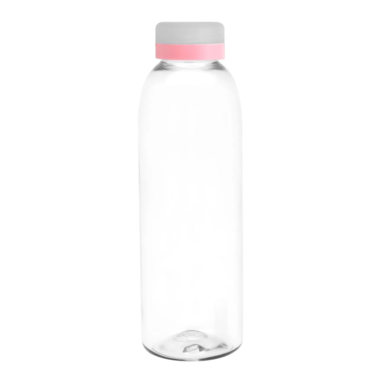Diseño práctico para un uso diario.Botella de plástico transparente con tapa a rosca esmerilada con anillo de silicona de diferentes colores.Medidas: Ø 7 x 23 cm.