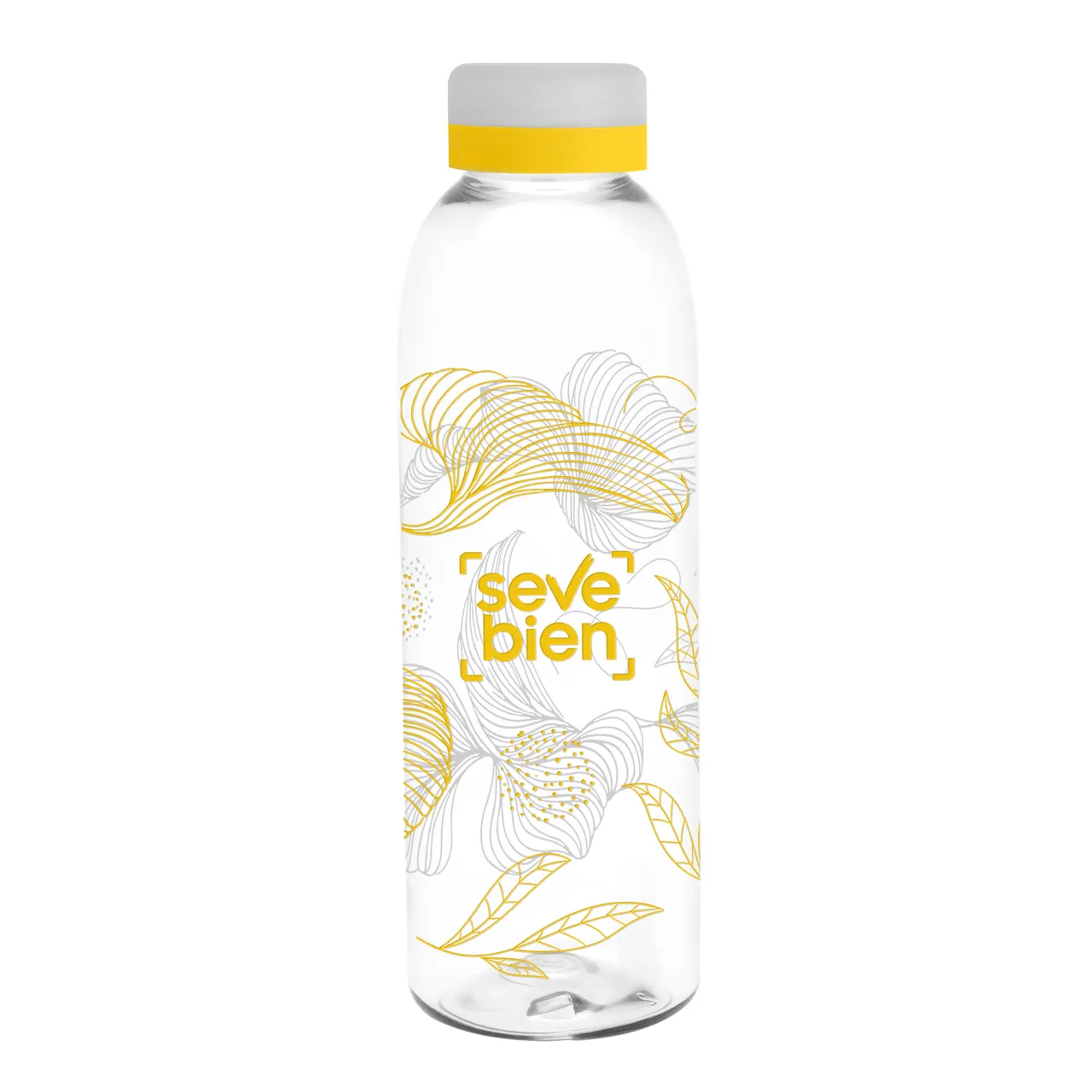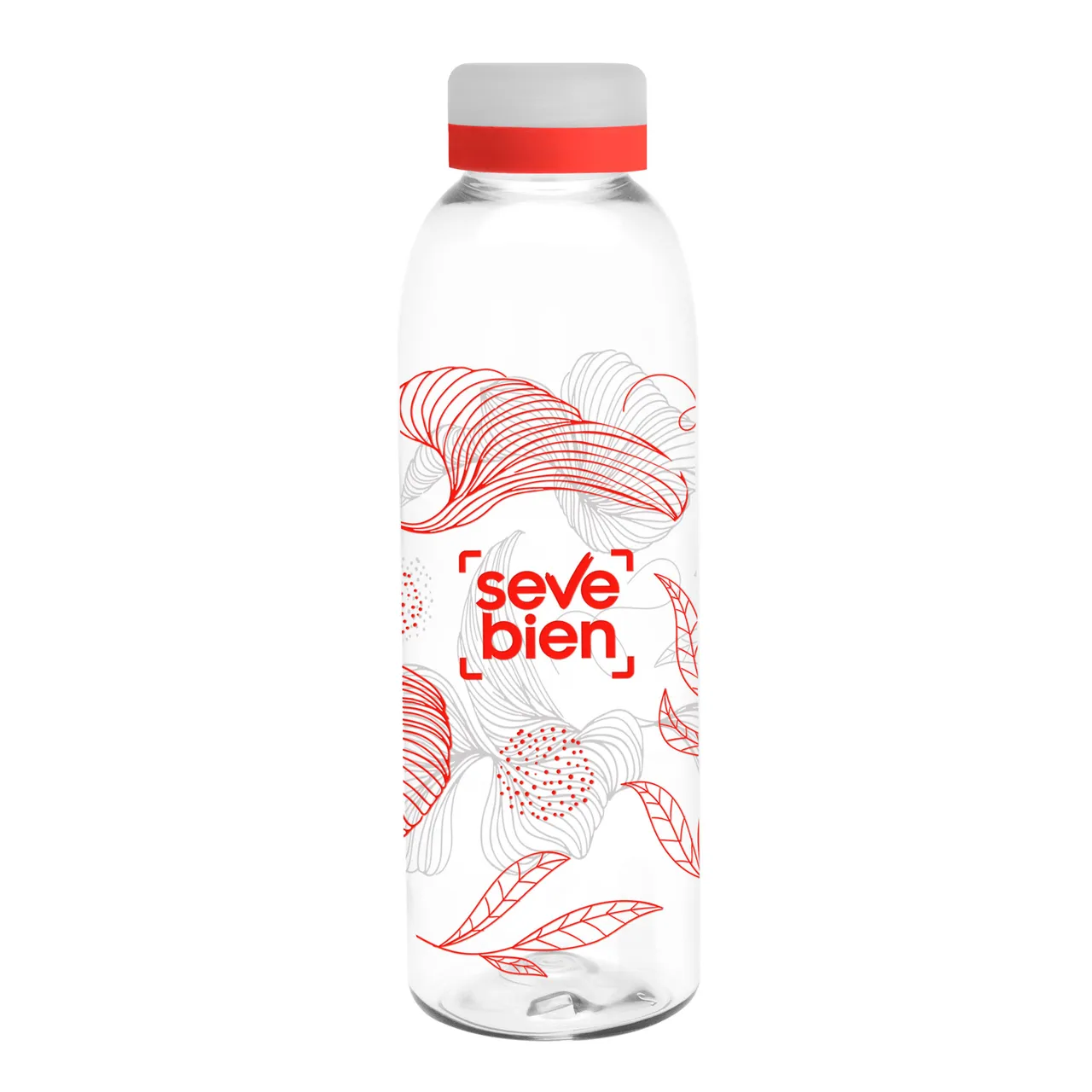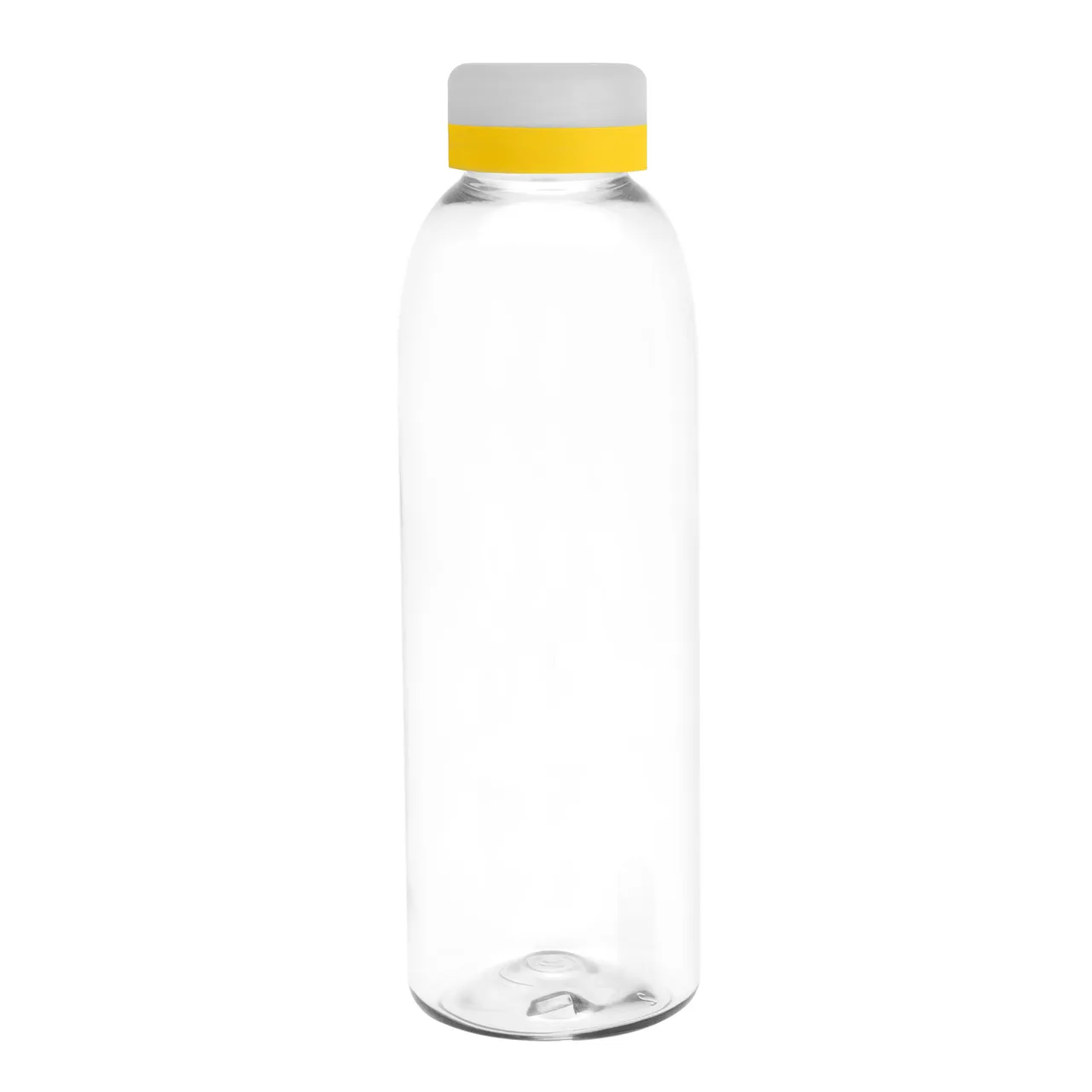 Diseño práctico para un uso diario.Botella de plástico transparente con tapa a rosca esmerilada con anillo de silicona de diferentes colores.Medidas: Ø 7 x 23 cm.