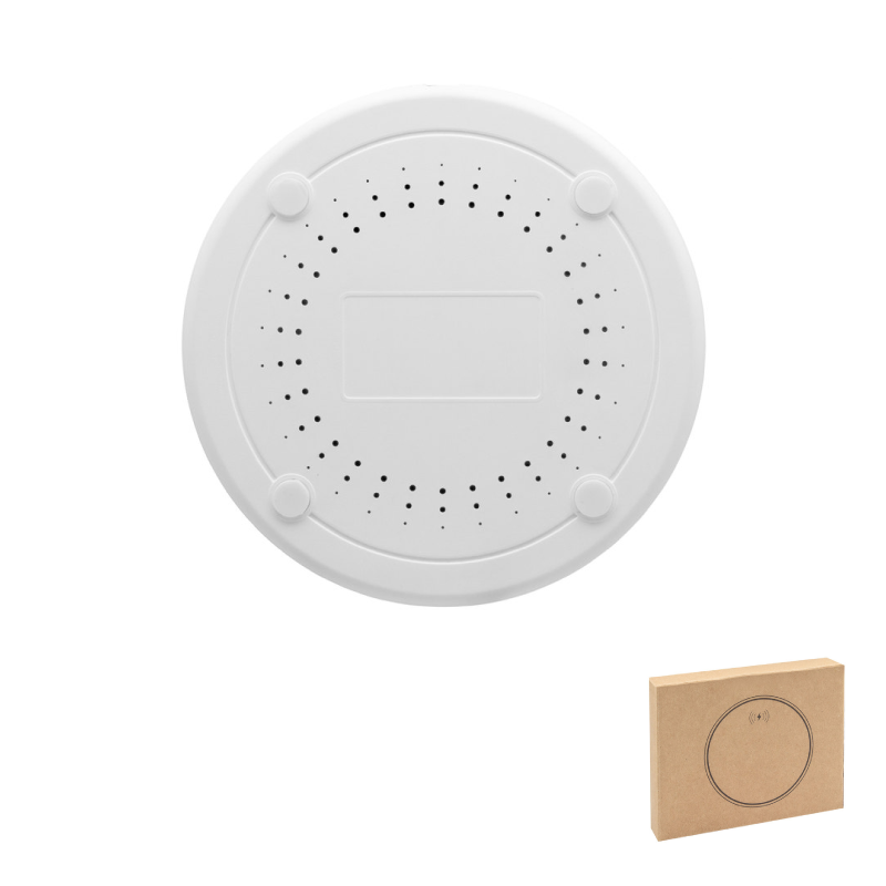 Carga sin cables, vive sin límites. Cargador inalámbrico. Base plástica color blanco con antideslizantes. Entrada: 5V/2A, 9V/1.1A. Salida: 10 watts. Distancia de transmisión: <=8 mm. Eficiencia de Carga: >=73%. Control de temperatura. Detección de objetos extraños. Luces indicadoras de carga. Cable de carga USB-C en color blanco de 50 cm de largo.