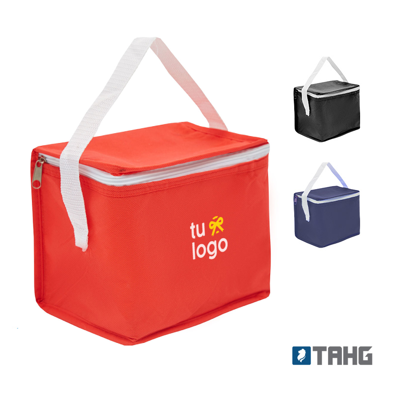 Realizado en Friselina (NON WOVEN). Interior en aluminio y PE Foam 2mm. Tiras para sujetar. Compartimiento principal superior. Medidas: 20 x 14 x 15,5 cm. Capacidad 4,5 Lts. Tahg