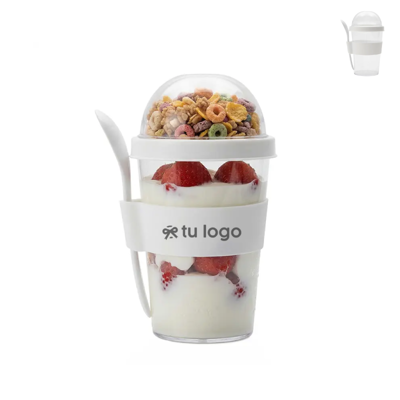 Jarro con compartimento superior y cuchara, fabricado en plástico PS con tapa de polipropileno y grip de silicona. Cuenta con domo transparente para cereales o toppings y cuchara incluida. Es ideal para desayunos saludables y prácticos fuera de casa, en la oficina o en viajes. Capacidad: 400 ml (jarro) + 130 ml (domo). Dimensiones: 15.8 × 9 cm (diámetro)
