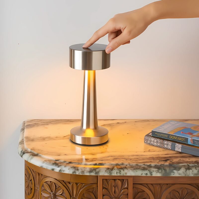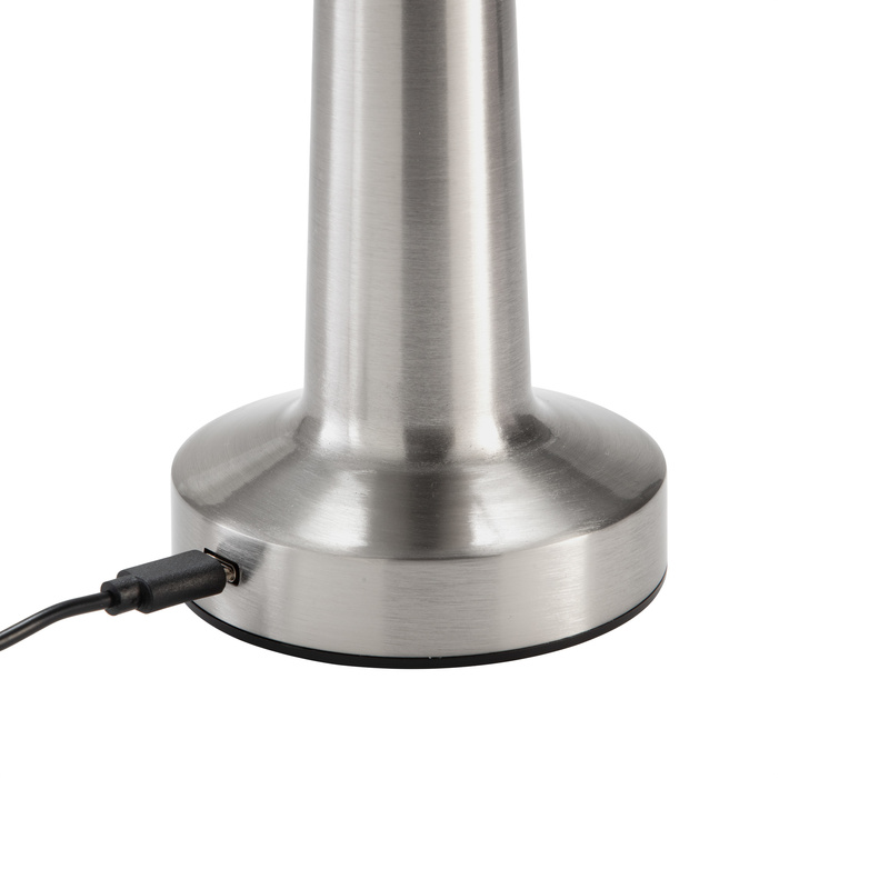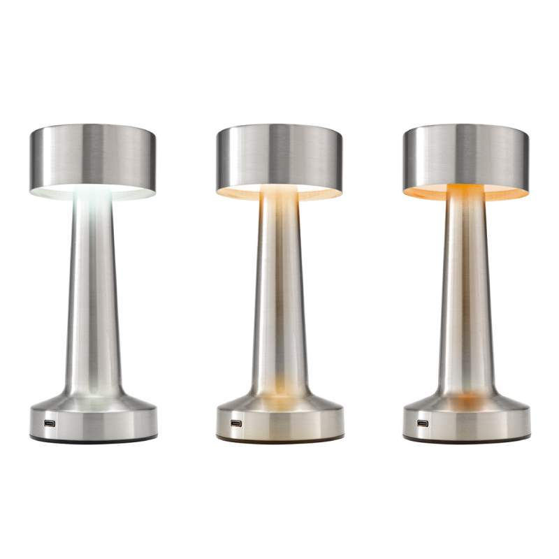 Tres modos de luz para iluminar tu espacio con estilo y versatilidad. Lámpara. Luz led. Botón táctil de encendido/apagado que regula la intensidad y cambia tres modos de luz (cálida, blanca y blanca cálida). Pintura con acabado mate (color negro) y con acabado brillante (plata y cobre). Batería de litio recargable. Conexión USB-C. Incluye cable de carga color negro.Medidas: Ø 9,5 x 21,5 cm.