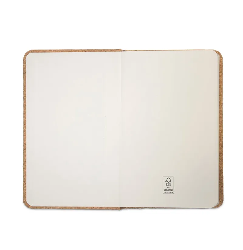 Fabricado con material certificado FSC™ y otros materiales controlados.. Material: Tapa dura corcho, hojas lisas. Tamaño: 90 x 142 mm. Área de impresión: 70 x 120 mm