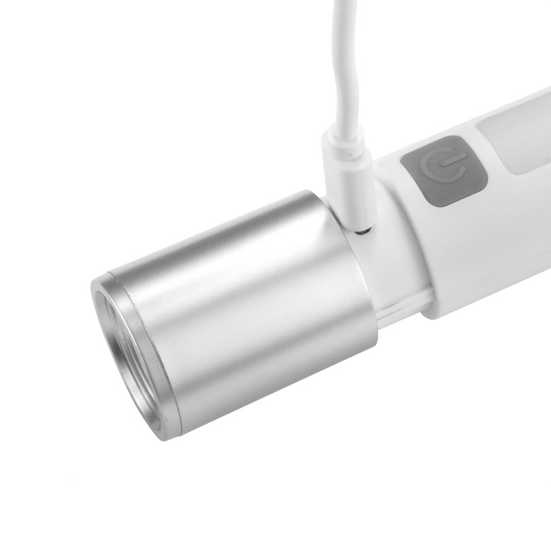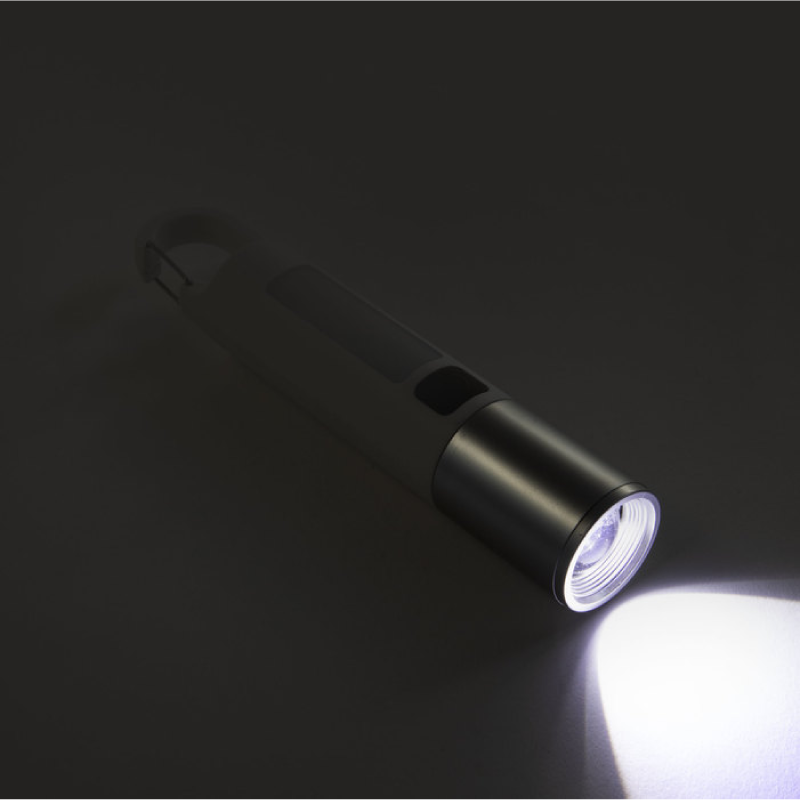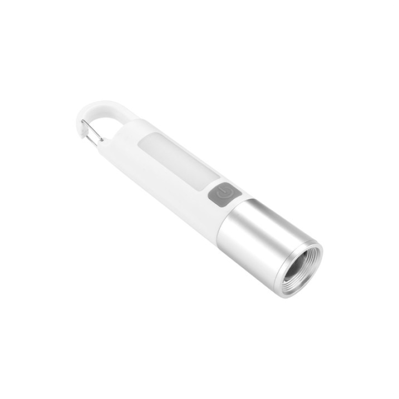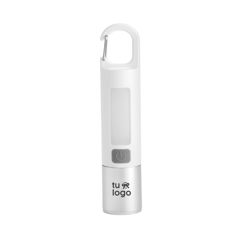 Luz potente siempre a tu alcance. Linterna portátil recargable. Con mosquetón incorporado. Luz de emergencia y 2 intensidades de iluminación (alta e intermitente). Batería recargable 800 mAh. Fuente de luz 7 leds de alta potencia. Puerto USB-C oculto (se desplaza el cuerpo hacia arriba). Cable de carga color blanco. Medidas: Ø 3 cm x 15,8 cm.