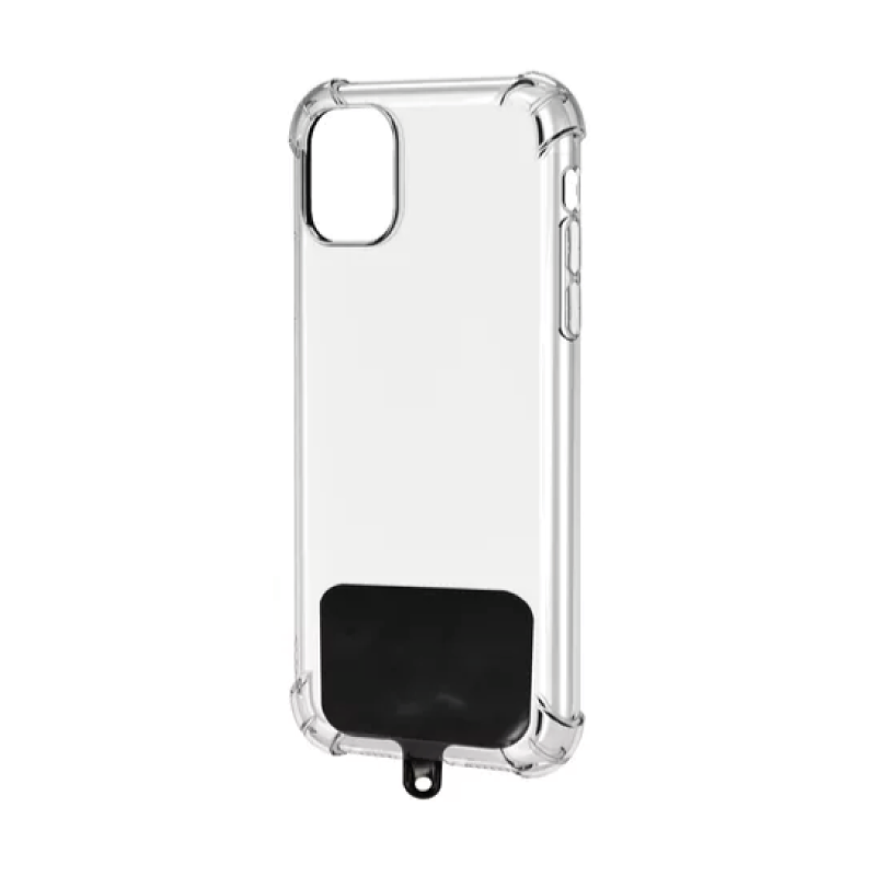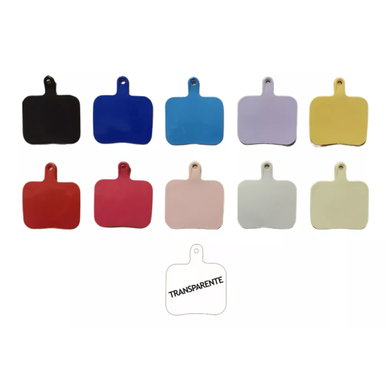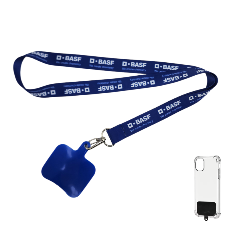 Con mosquetón aznuelo de zamak niquelado + soporte para celular (relizado en plástico flexible de alta resistencia).