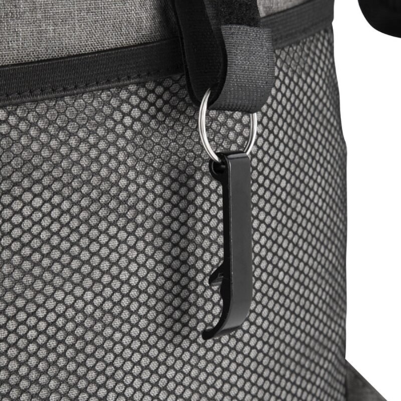 Tu mejor aliada para salidas, picnics y viajes. Mochila cooler. Compartimento principal con cierre en la parte superior. Compartimento frontal con cierre. Dos bolsillos laterales de red multipropósito. Incluye llavero destapador de botellas de aluminio (5,5 x 1,1 cm) extraíble. Correas regulables acolchadas y reforzadas. Cierres metálicos. Tiradores de cierre metálicos de color negro.Medidas: 40 x 26 x 19 cm.