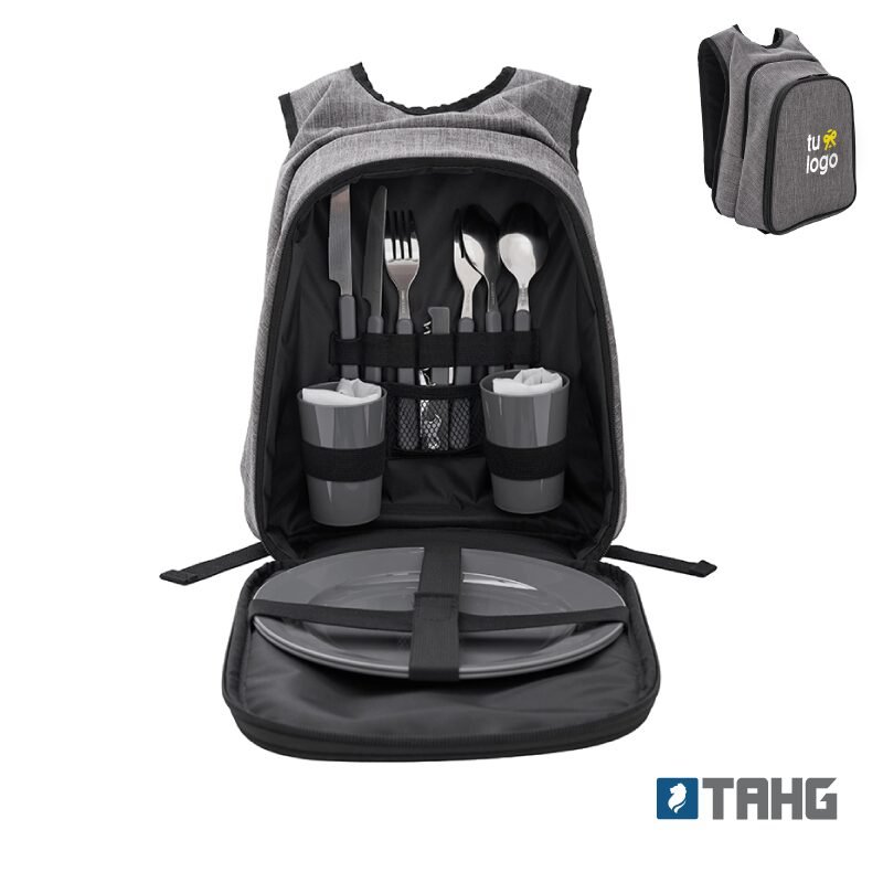 Mochila funcional y moderna para llevar alimentos y bebidas. Fabricada con polycanvas y revestimiento interior térmico de PEVA. Cuenta con compartimento principal amplio para alimentos, compartimento secundario para utensilios o accesorios y correas acolchadas ajustables. Incluye un completo set de picnic con platos, vasos, cubiertos y sacacorcho, todo en el mismo tono. Ideal para picnics, salidas al aire libre, días de campo o viajes, manteniendo todo organizado y fresco.