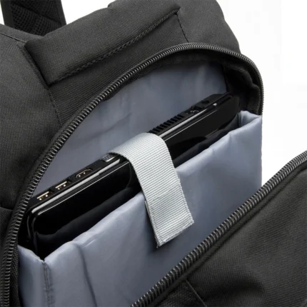 Mochila de Polyester con compartimento principal que incluye porta laptop. Compartimento secundario con organizador. Bolsillos laterales. Espalda y manijas acolchadas. Refuerzo para cargas pesadas, cierre con zip antideslizante, cierres invertidos. Medidas: 45 x 31,5 x 9 cm. Laptop: 17”. Capacidad: 15 Lts.