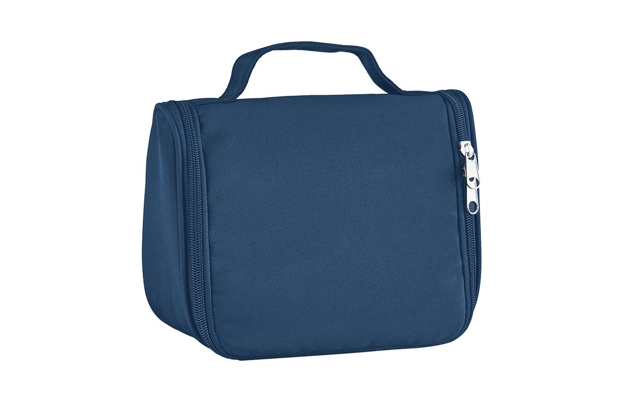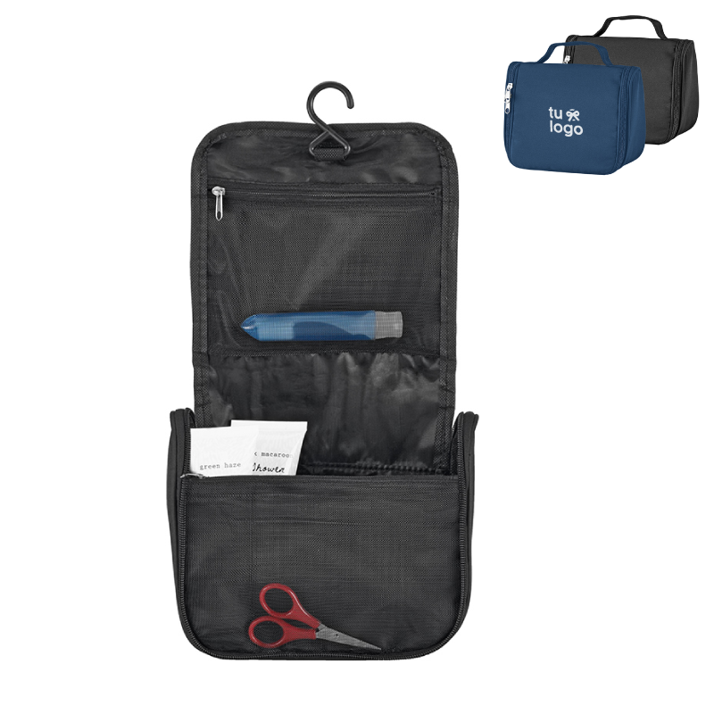 Necessaire de microfibra con compartimento principal, bolsillo de red y gancho para colgar. Cierre de apertura completa. Ideal para viajes.