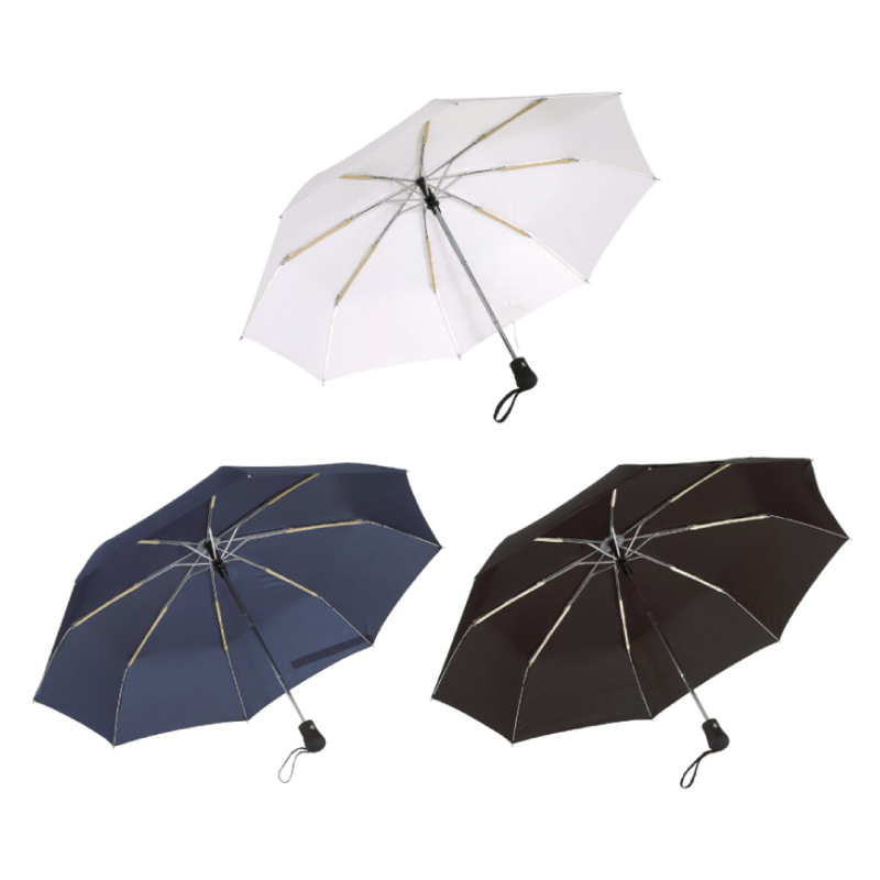 Ø 97 cm. Metal y políester. 8 varillas metálicas, mango recubierto de goma, en poliéster-pongee con revestimiento especial hidrófugo, cierre con velcro. APERTURA Y CIERRE AUTOMÁTICO