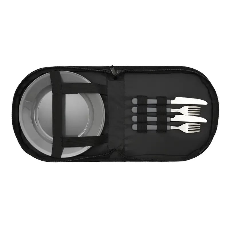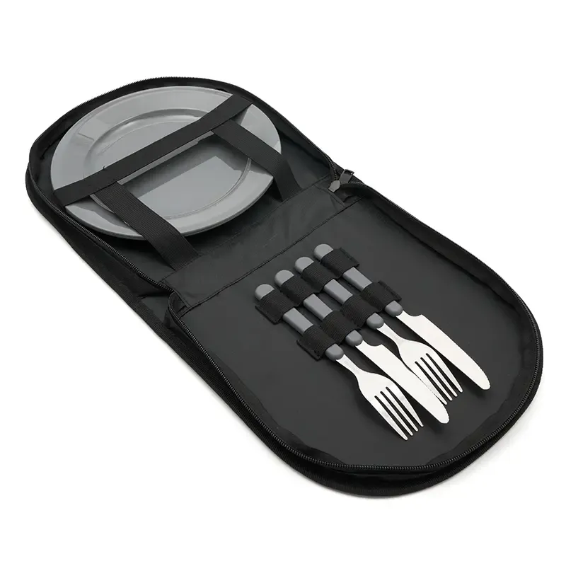 Set de asado con funda organizadora compacta. Hecho en polycanvas de alta calidad, con detalles reforzados y cierre de cremallera resistente. Cuenta con bolsillo frontal, manija superior, 2 tenedores, 2 cuchillos y 2 platos, todo sujeto con bandas elásticas. Es ideal para llevar a picnics, campings o disfrutar un asado al aire libre.