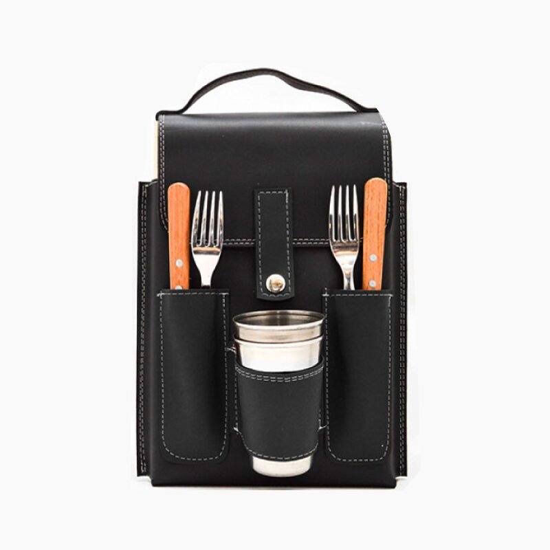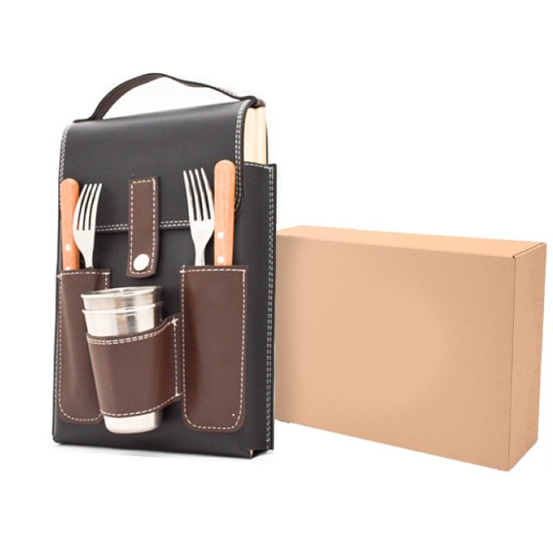 Set de asado para una persona. Estuche de ecocuero. Incluye: 2 juego de cubiertos (cuchillo y tenedor, marca: Tramontina), 2 vasos de aluminio de 250 ml y 2 platos de pino (28 x 18 x 1,5 cm).