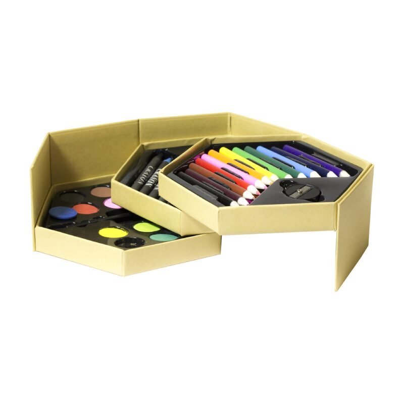16 x 8 cm. (cerrado) 44 x 8 cm. (abierto). Cartón. Set de pinturas en forma de hexágono. 12 lápices de colores, 1 sacapuntas, 12 crayones, 1 goma de borrar, 12 acuarelas y 1 pincel.