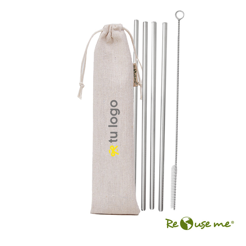 Set de 4 sorbetes reutilizables, confeccionados 100% en acero inoxidable. Incluye cepillo limpiador y funda de lienzo para su transporte. Producto aprobado por el I.N.A.L. para el contacto con alimentos.