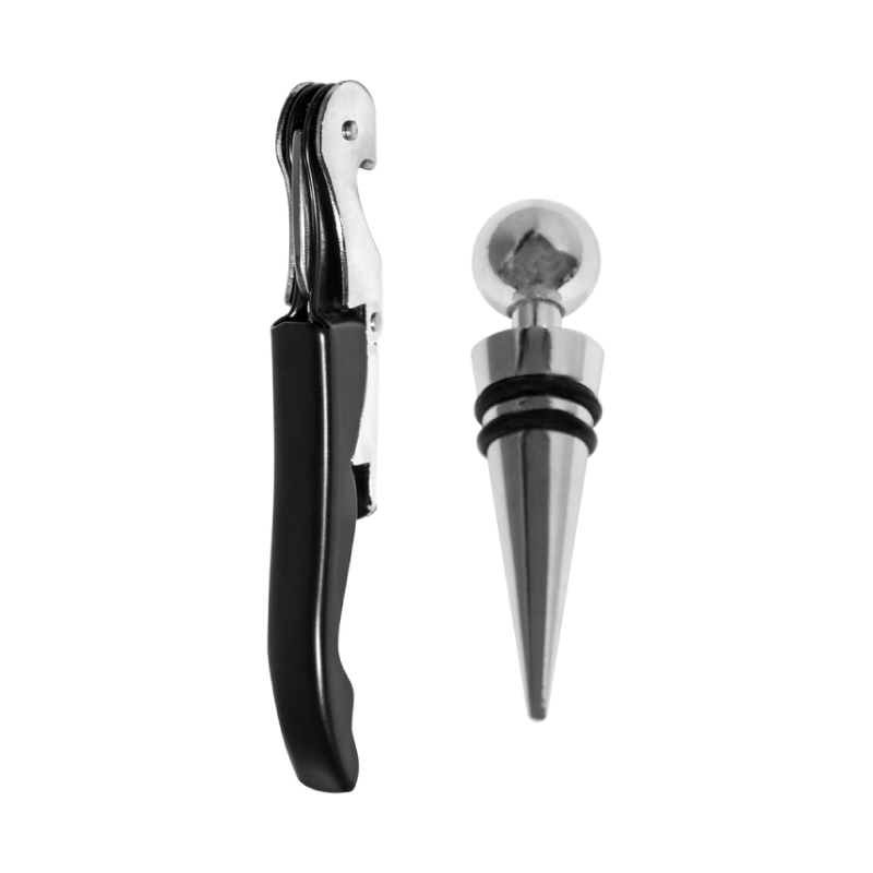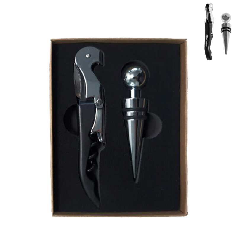13 x 10 x 2,5 cm. Metal. Accesorios para vinos. Sacacorcho y tapón en metal. Estuche de cartón. Presentación en caja de regalo.