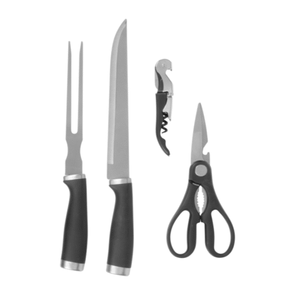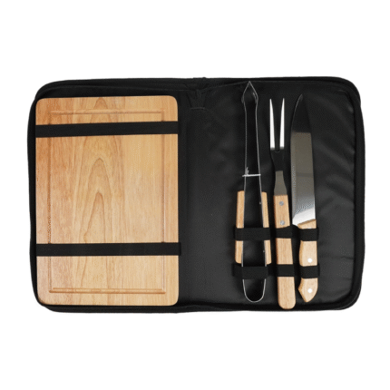 Set de asado con cuchillo, tenedor y pinza. Fabricado en madera de hevea y acero inoxidable 420. Contiene cuchillo, tenedor trinchador , pinza para asado y bolsa de guardado de nylon. Es ideal para manipular cortes de carne con precisión y comodidad durante la parrilla o asados al aire libre.