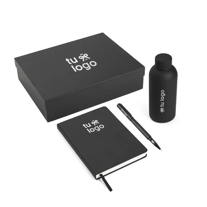 Set corporativo en caja laminada mate de papel. Cuenta con un cuaderno A5 de hojas rayadas, bolígrafo roller y una botella reutilizable de acero inoxidable con una capacidad de 350ml. Es ideal para regalos corporativos, kits de bienvenida, acciones promocionales o para uso ejecutivo diario.